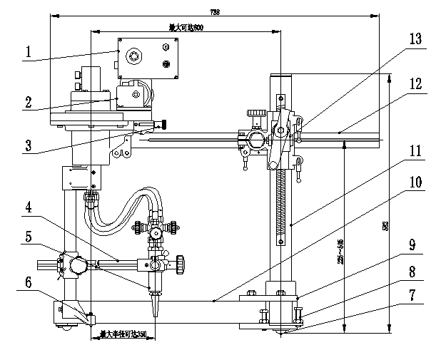 標(biāo)準(zhǔn)型CG2-600割圓機(jī),其標(biāo)配有一把割炬。“CG2-600”型半自動(dòng)割圓機(jī)采用鋁合金鑄造而成,輕巧便攜。機(jī)械兩檔變速,調(diào)速系統(tǒng)采用可控硅觸角調(diào)速,運(yùn)行速度平穩(wěn)。機(jī)身底腳裝有滾輪,移動(dòng)方便。本裝置通過其底座上三個(gè)支撐點(diǎn)放置在被切割鋼板上。電機(jī)通過減速箱變速,帶動(dòng)中心軸作旋轉(zhuǎn)運(yùn)動(dòng)進(jìn)行切割,割圓半徑根據(jù)需要可調(diào)節(jié),也可在鋼板豎直和角度擺放情況下進(jìn)行切割。使用該割圓機(jī)可提高工效、保證切割質(zhì)量有效減輕工人的勞動(dòng)強(qiáng)度。本機(jī)采用兩檔變速,調(diào)速系統(tǒng)采用可控硅觸角調(diào)速,調(diào)節(jié)精確。割炬總路設(shè)有總閥,切割同厚度的鋼板只需調(diào)整火焰一次,以后無需再調(diào)整。本裝置配有氣體旋轉(zhuǎn)分配器,膠管不纏繞。本裝置,有效減少了勞動(dòng)時(shí)間,降低了工人的勞動(dòng)強(qiáng)度,一定程度地提高了工作效率。